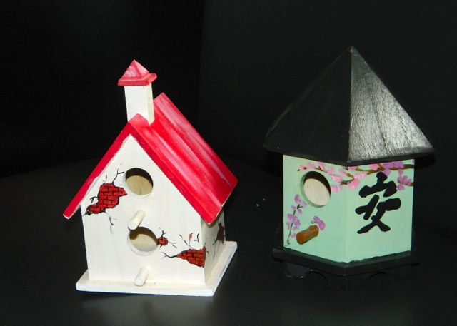 The teachers also made birdhouses: The Elvis birdhouse, The Japanese and brick-looking birdhouse, and the blue painted birdhouse with a red cardinal on it were made by teachers."